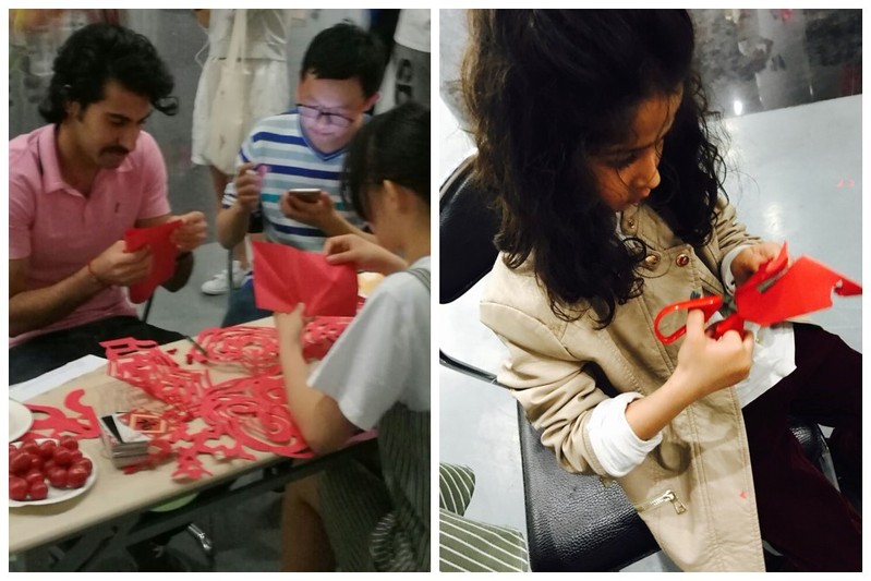 来自巴基斯坦的两位同学正在学剪窗花