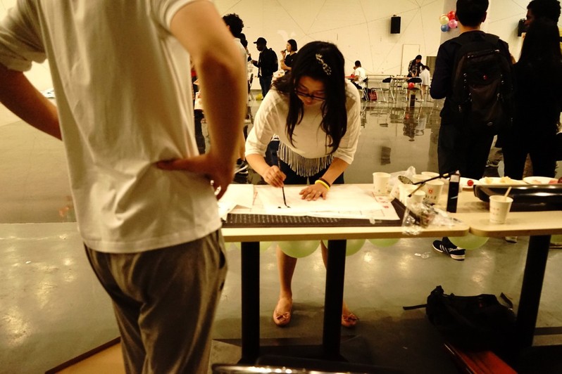 书法展台负责同学在演示中华书法