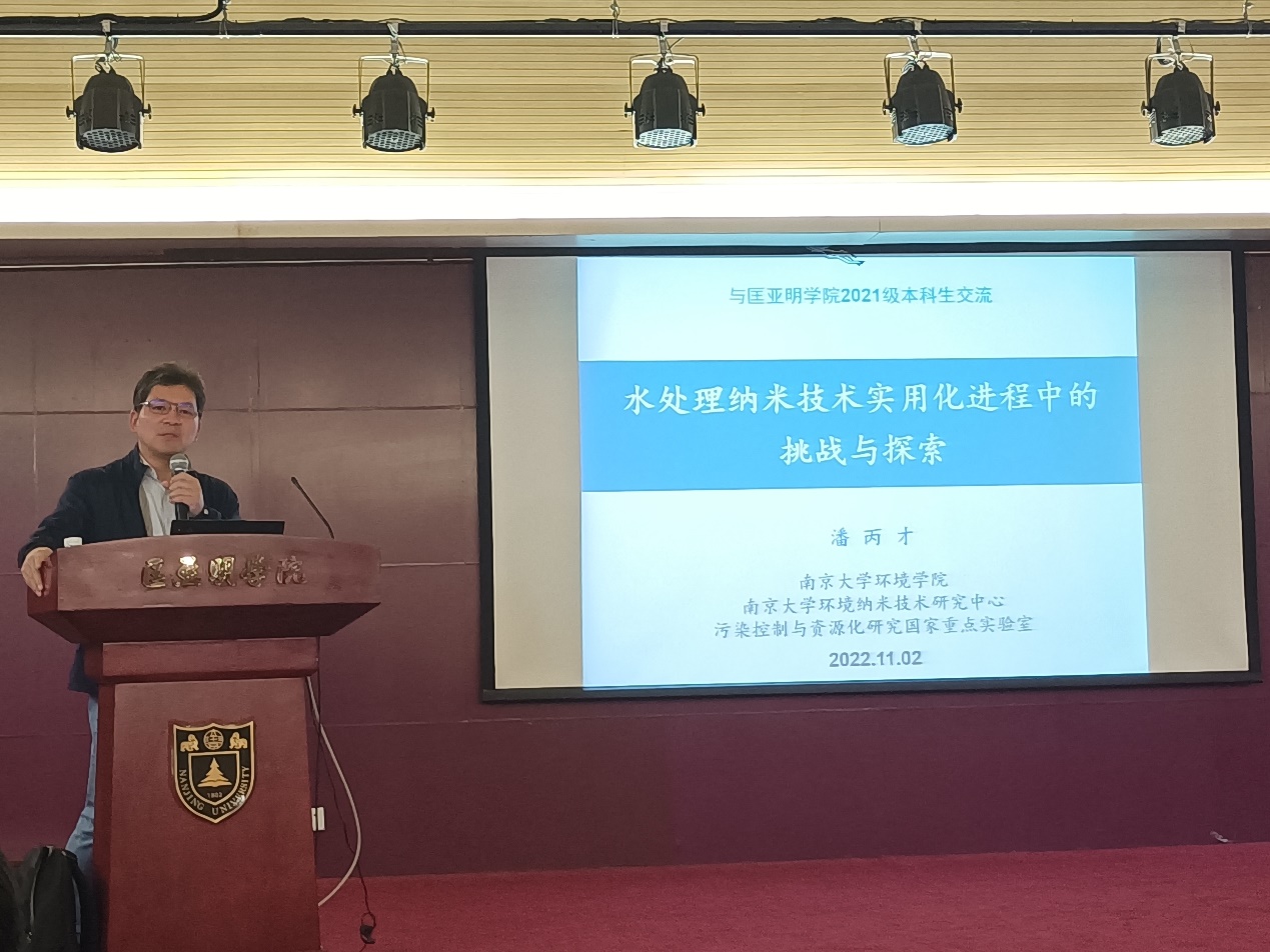11月2日下午,《名师导学》系列讲座第六讲在匡亚明学院国生报告厅如期举行。本次讲座邀请环境学院副院长潘丙才教授主讲,题目为《水处理纳米技术实用化进程中的挑战与探索》。、。潘教授现任南京大学环境纳米技术研究中心主任、国家有机毒物污染控制与资源化工程技术研究中心副主任、教育部长江学者奖励计划特聘教授、国家杰出青年基金获得者、国家高层次人才特殊支持计划科技创领军人才。潘丙才教授主讲,题目为《水处理纳米技术实用化进程中的挑战与探索》。
