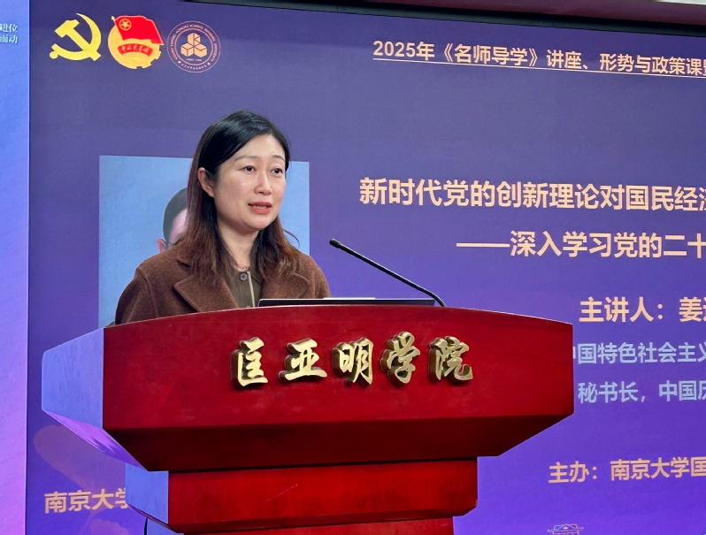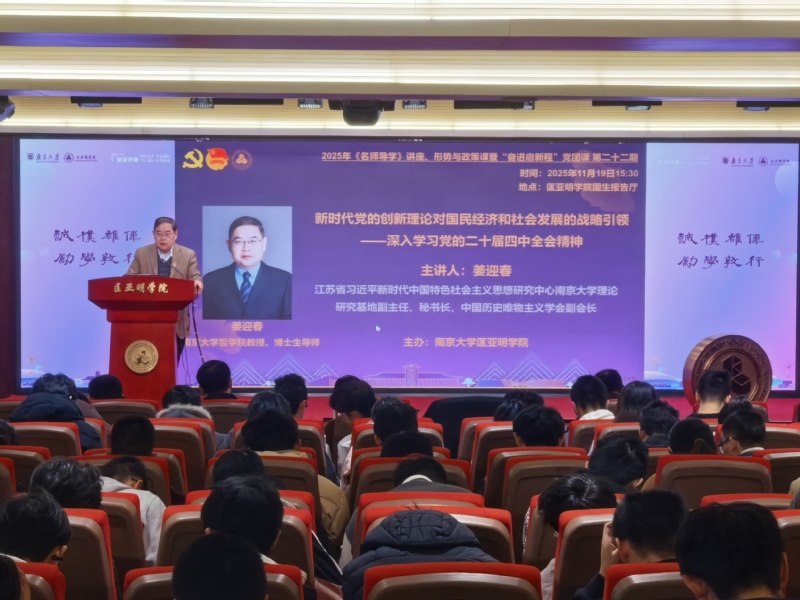 11月19日,匡亚明学院举办“奋进启新程”党团课暨《名师导学》课程,专题学习党的二十届四中全会精神。江苏省习近平新时代中国特色社会主义思想研究中心南京大学理论研究基地副主任、中国历史唯物主义学会副会长、哲学学院教授姜迎春做题为“新时代党的创新理论对国民经济和社会发展的战略引领——深入学习党的二十届四中全会精神”的专题报告。匡亚明学院党委副书记周安、副院长董昊、院长助理胡晶磊,师生党团员代表,课程学员200余人参加。课程由匡亚明学院党委书记周媛主持。