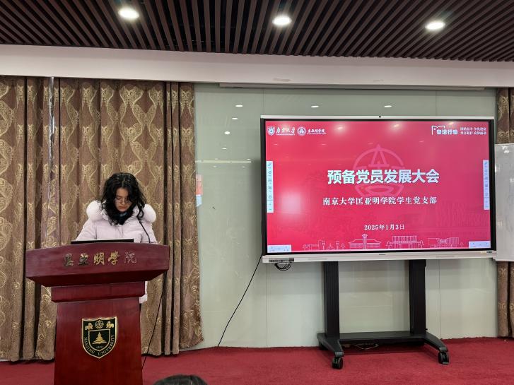 2025年1月3日中午,匡亚明学院预备党员发展大会在郑刚厅隆重举行。匡亚明学院党委副书记周安,辅导员赵玉倩、陈丹、司林敏,本科生院兼职辅导员许梦溪以及匡亚明学院学生党支部全体党员参加了此次大会。会议由支委刘鹏飞同志主持。