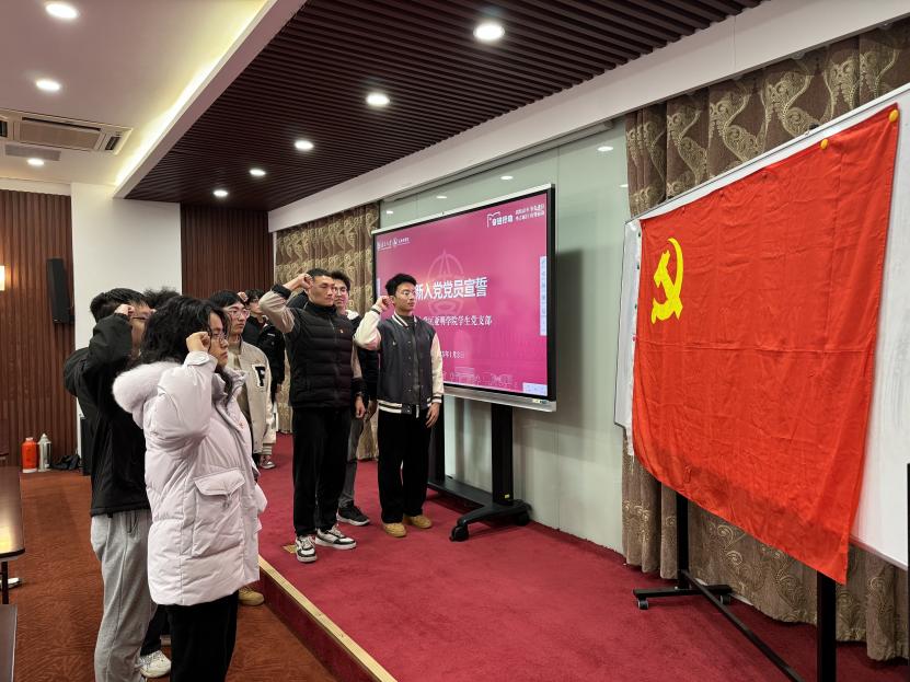 仪式进入最为庄重的环节——入党宣誓。在支委李昊同志的带领下,全体新发展党员面向党旗,整齐列队,高举右拳,以铿锵有力的声音宣读入党誓词。一句句誓言回荡在会场,彰显着新党员对党的忠诚与信念,也将仪式的氛围推向高潮。