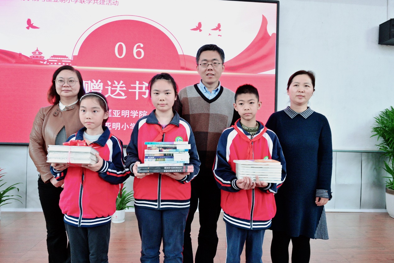 匡亚明学院教师代表向匡亚明小学少先队员赠送书籍,表达了对少先队员通过读书不断丰盈精神宝库的美好祝愿。