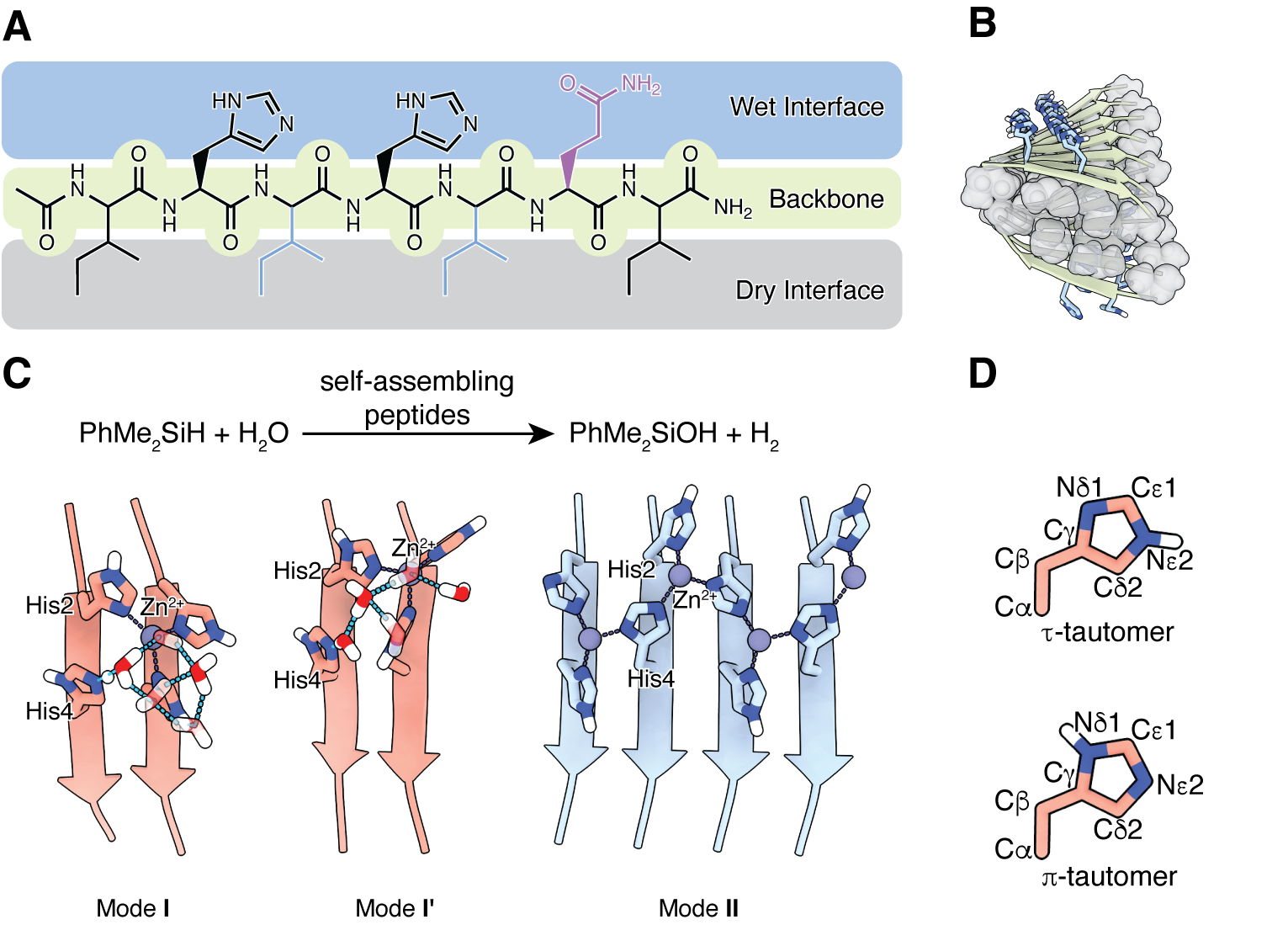 近日,该课题组发表论文,首次报道了基于理性设计的功能性多肽自组装体在室温条件下催化硅烷水解产生氢气的研究工作。借助多尺度理论计算,研究团队预测了一类具有两亲性的七肽能自组装形成纤维结构,并有效催化二甲基苯基硅烷等一系列硅烷的水解反应。后续的湿实验中,通过气相色谱法定量检测氢气生成,实验证实了理论预测的准确性,从而显著扩展了功能性自组装多肽在催化反应中的应用。此外,结合分子动力学模拟与多种实验表征手段,如原子力显微镜、圆二色谱和固态核磁共振,研究人员揭示了多肽序列调控自组装结构和催化功能的能力,以及催化中心的双重模式,进一步建立了功能性多肽自组装体系的构效关系。