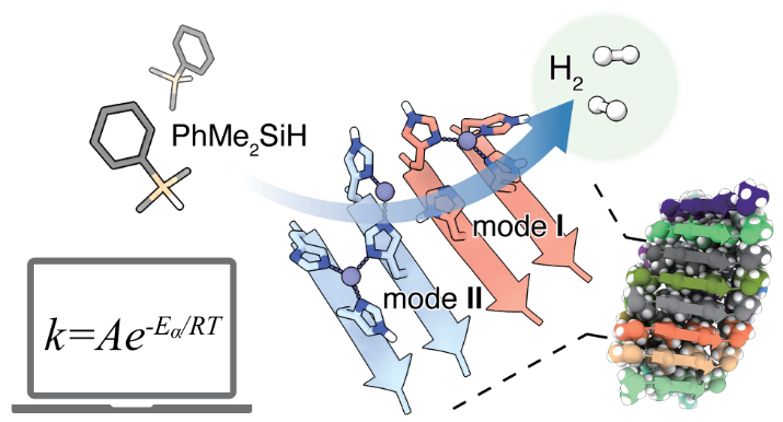 基于对催化中心的深入理解,研究人员构建了多种可能的催化反应中心结构(图1)。随后基于密度泛函方法,计算得到了自组装多肽侧链构成的反应中心催化硅烷水解产氢的完整反应路径。结果表明,多肽序列的差异会导致催化反应中心金属离子配位微环境存在差异,但不同自组装体发生催化反应的决速步均为金属中心活化的羟基对底物硅烷上硅中心的亲核进攻,且计算得到的自由能垒表明这些反应在室温下自发进行是可行的(图2)。