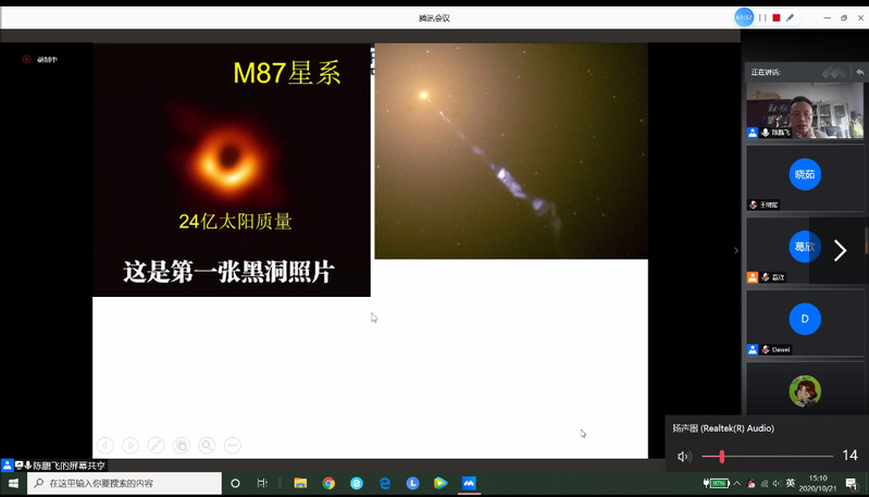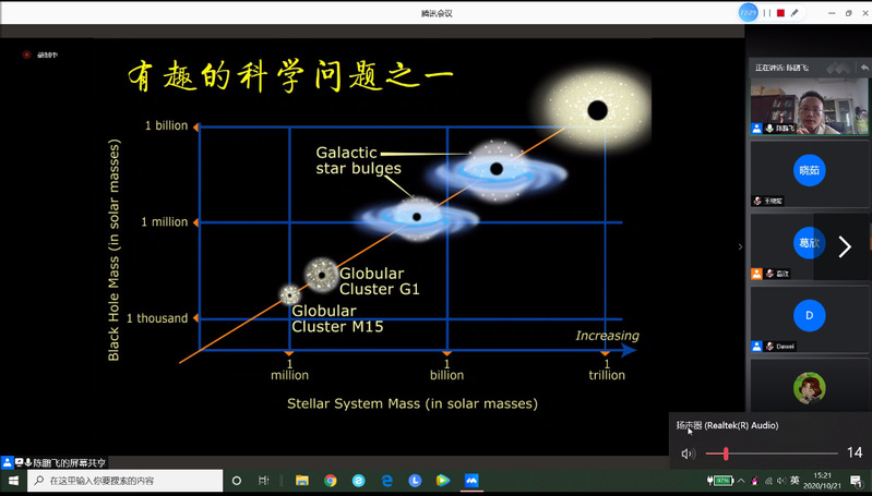 2020年10月21日,南京大学匡亚明学院又举办了线上名师导学讲座,陈老师首先从诺贝尔物理学奖讲起,对比这些年诺贝尔物理学奖的获奖领域就会发现近几年天体物理的发展趋势。然后陈老师就进入今天的主题“黑洞”,陈老师说他其实是“门外汉”,今天的讲座其实是一个故事性质。在今天的课程中,我们了解到很多很多的天体,比如太阳、白矮星等等。我们也看到了M87中心的黑洞照片,这也是洗了两年之久的第一张黑洞照片。陈老师也给我们介绍了三个有趣的科学问题——黑洞的质量与黑洞所在星系质量成线性关系、能量、引力波。陈老师用这三个科学问题结束了今天的讲座。
