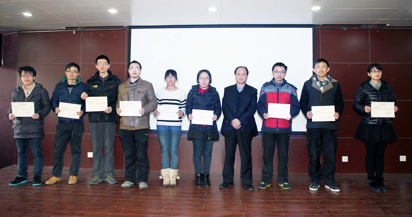 颁奖仪式上,葛欣副院长致辞,向获奖同学本年度在学习科研等多方面取得的优异成绩表示祝贺,并向同学们介绍了拔尖计划“一制三化——导师制、小班化、国际化、个性化”培养方案,并祝同学们期末考试顺利。乔蔚虹副院长宣读《南京大学匡亚明学院2014年度颁发拔尖计划奖学金决定》。王炜院长、乔蔚虹副院长、葛欣副院长、唐健老师为匡亚明学院2011级、2012级、2013级获奖学生颁奖并合影留念。