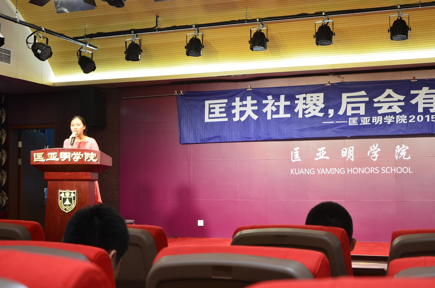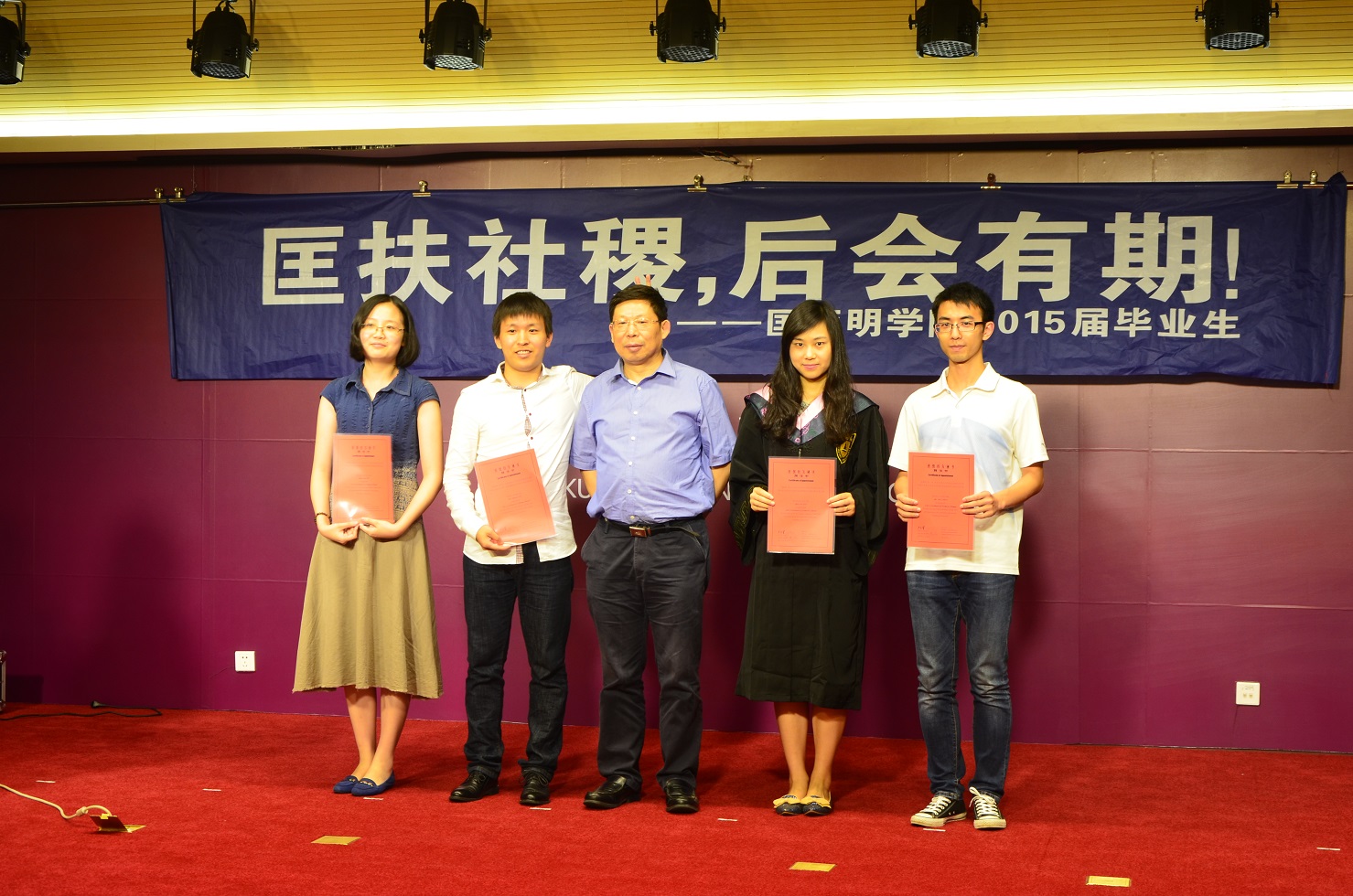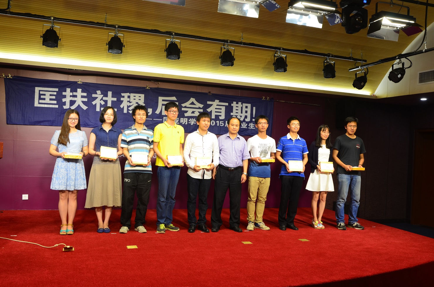 同为2011级、2015届,但28个院系中,唯独匡亚明学院的学生们已经共同走过四年半的时光——提前进入预备班、早一步熟悉大学的节奏,这份特殊的相遇让我院毕业生之间情谊更加深厚。然而时光易逝,还来不及好好感悟这四年间的缘分,毕业已如期而来。2015年6月23日晚,匡亚明学院2015届本科生毕业典礼在仙林校区潘琦楼匡亚明学院四楼报告厅举行。匡亚明学院院长王炜老师,副院长乔蔚虹老师、葛欣老师,辅导员陈浩老师、唐健老师以及2015届的全体毕业生参加典礼。“匡扶社稷,后会有期”——报告厅前方横幅上的话饱含期待,触动起大家心中的丝丝离别感伤。