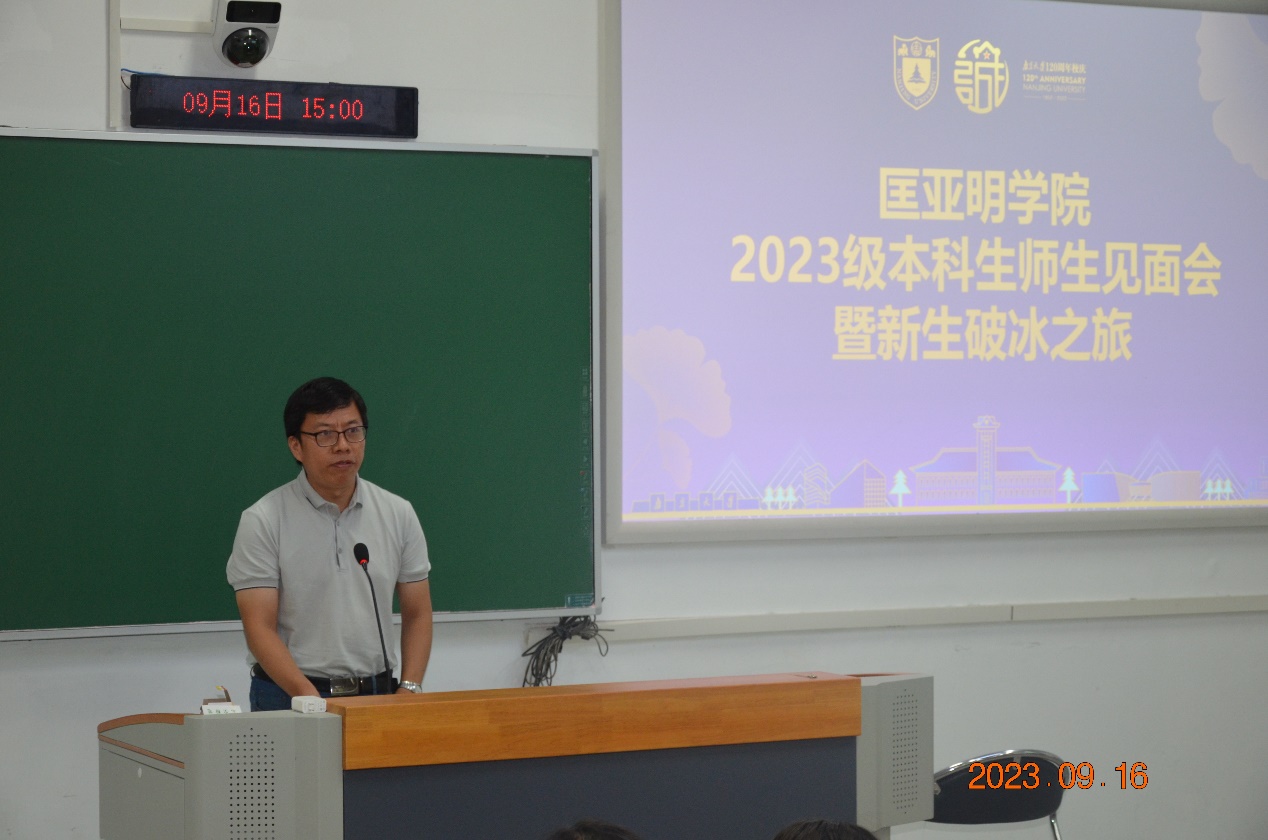 匡亚明学院党委书记、院长王骏首先发言,他以学长、老师以及院长的身份给予了同学们多方面的经验以及建议,告诉同学们要珍惜四年匡院学习的大好时光,在大理科班要以全方位的视角要求自己,实现学科间交叉联系以及自己的多角度思维水平。在认真学习的同时,不要忘记和老师、前辈们多多交流,获得更多的感悟与理解,老师们也会积极地解决同学们的各种疑问,帮助同学们成为一名优秀的科研人才。