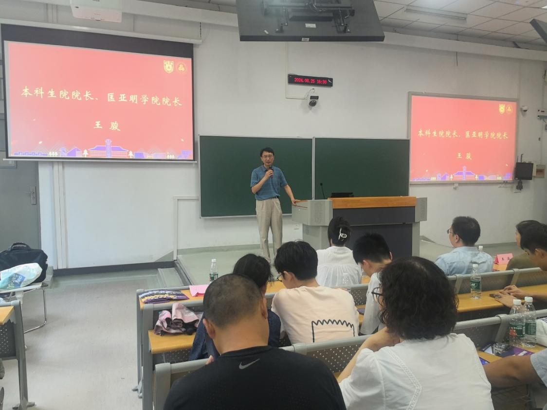 2024年8月25日下午,“同心奋进,共启新程”匡亚明学院2024级本科新生家长会和新生见面会暨“三室一厅”主题活动在鼓楼校区教学楼圆满举行。本科生院长、新生学院执行院长、匡亚明学院院长王骏,匡亚明学院党委书记周媛,党委副书记周安,教务员王芳,辅导员陈丹,有训书院事务中心主任蒲婧翔以及24级匡亚明学院学生、家长一百余人共同参加活动。活动由新生学院辅导员杨娟主持。
