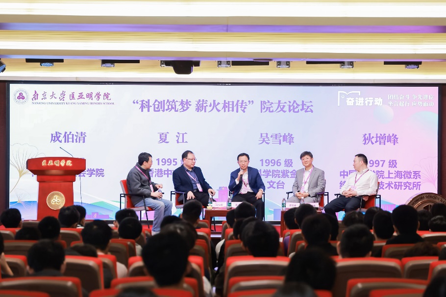 大会第二阶段,学院举办了“新时代卓越人才创新能力培养研讨会”。王骏召集发起了“科创筑梦 薪火相传”院友论坛。1985级院友、南京大学社会学院教授成伯清,1995级院友、香港中文大学教授夏江,1996级院友、紫金山天文台副台长吴雪峰,1997级院友、中国科学院上海微系统与信息技术研究所党委书记狄增峰四位院友分享了个人成长故事与科研经历,并就跨学科学习、国际化视野、学习科研与生活平衡等话题与匡亚明学院在读学生开展交流。