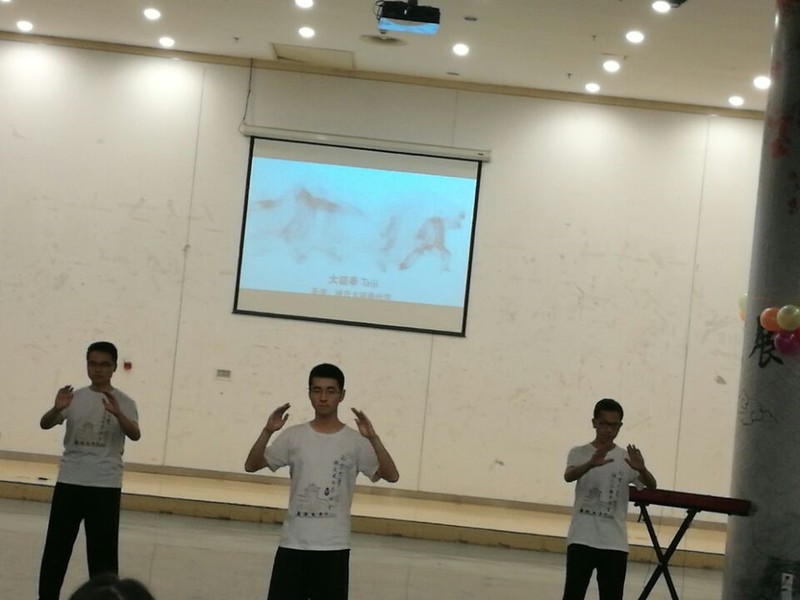 来自“太极拳社”的太极拳表演,以其诚朴雄伟、稳健雄毅的风格和表演者隽逸流畅的动作得到了留学生的一致赞许,他们纷纷被吸引过来,上前模仿、交流与学习。