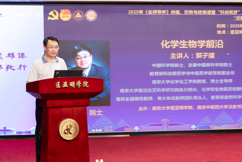 9月17日,匡亚明学院举办2025年名师导学暨形势与政策“科创筑梦”党团课第十五讲。本次课程邀请到中国科学院院士、南京大学前沿交叉科学研究院执行院长、南京大学化学和生物医药创新研究院院长郭子建做题为“金属化学生物学前沿”的专题报告。匡亚明学院党委书记周媛,副书记周安,副院长董昊,南京中医药大学淡安书院副书记、副院长(主持工作)张宏如,副书记、副院长陈娟,师生党团员代表,课程学员200余人参加。课程由本科生院院长、匡亚明学院院长王骏主持。