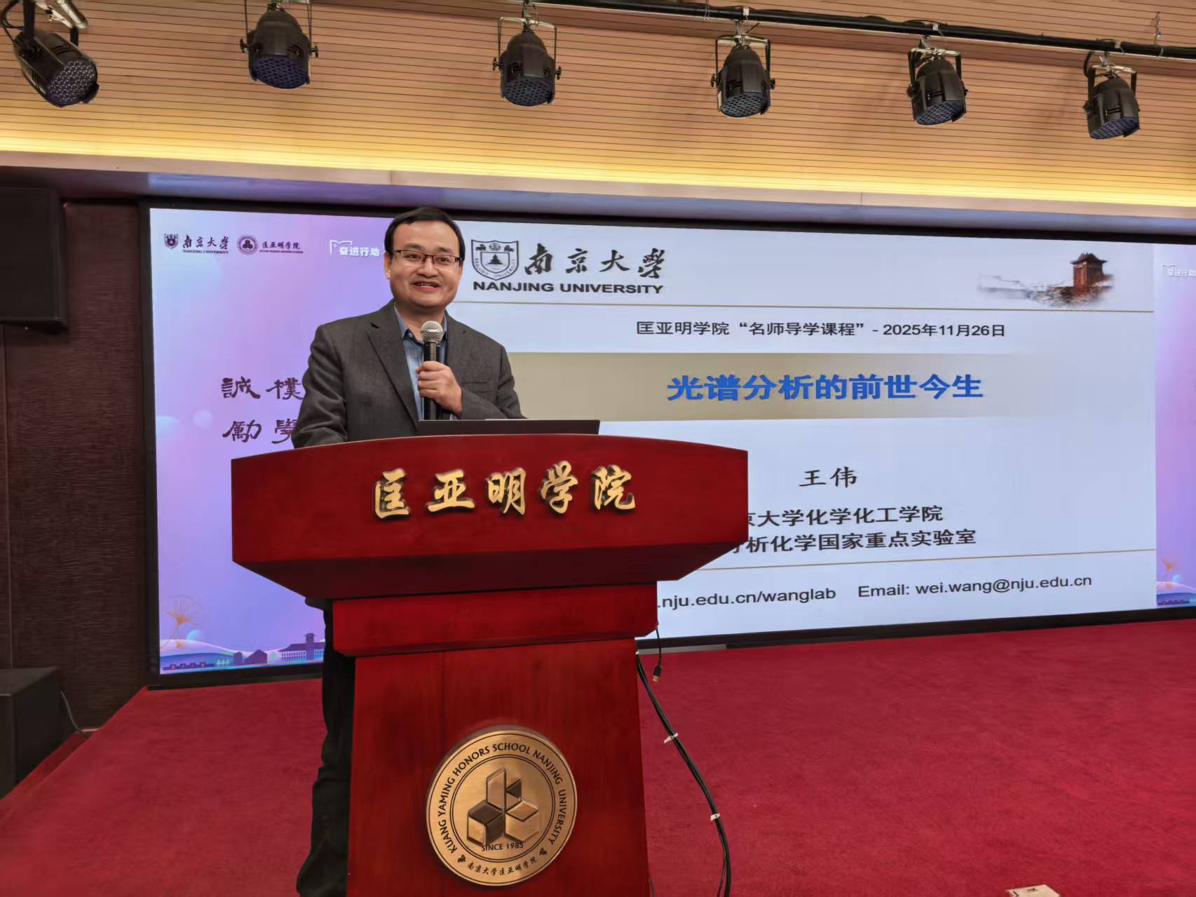 11月26日下午,《名师导学》课程在仙林校区匡亚明学院郑钢报告厅如期举行。本次讲座邀请到南京大学化学化工学院王伟教授,为同学们带来题为《光谱分析的前世今生》的课程讲座。王教授以其渊博的学识、清晰的逻辑和生动的讲解,引领听众完成了一次从光谱分析百年历史到生命科学最前沿应用的奇妙旅程。