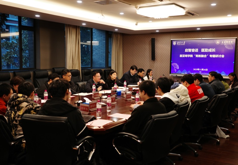 为进一步落实立德树人根本任务,加强班主任队伍建设,助力拔尖创新人才培养,2025年11月26日下午,“启智奋进 匡助成长”育教融合专题研讨会在仙林校区举行。匡亚明学院党委书记周媛、副院长董昊,以及班主任、课程教师代表、教务员、辅导员、学生代表等近20人参加研讨。活动由匡亚明学院党委副书记周安主持。