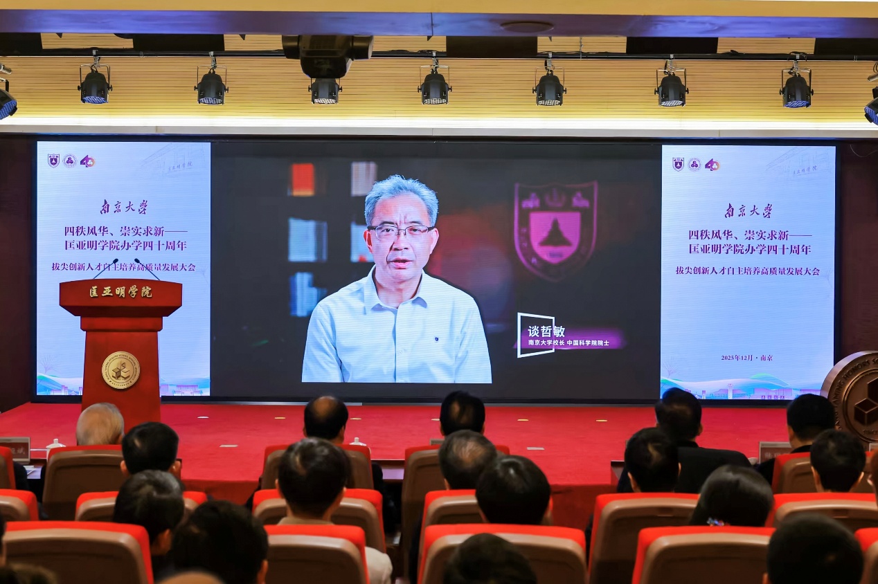 12月20日,南京大学匡亚明学院办学四十周年暨拔尖创新人才自主培养高质量发展大会在仙林校区潘琦楼匡亚明学院国生厅隆重举行。海内外校友、兄弟院校代表、学界同仁与师生代表欢聚一堂,共同回顾匡亚明学院四十年拔尖创新人才培养的奋进历程,展望高质量自主育人新篇章。南京大学党委书记、中国科学院院士谭铁牛,江苏省社科联党组书记王成斌,江苏省教育厅副厅长杨树兵出席大会。