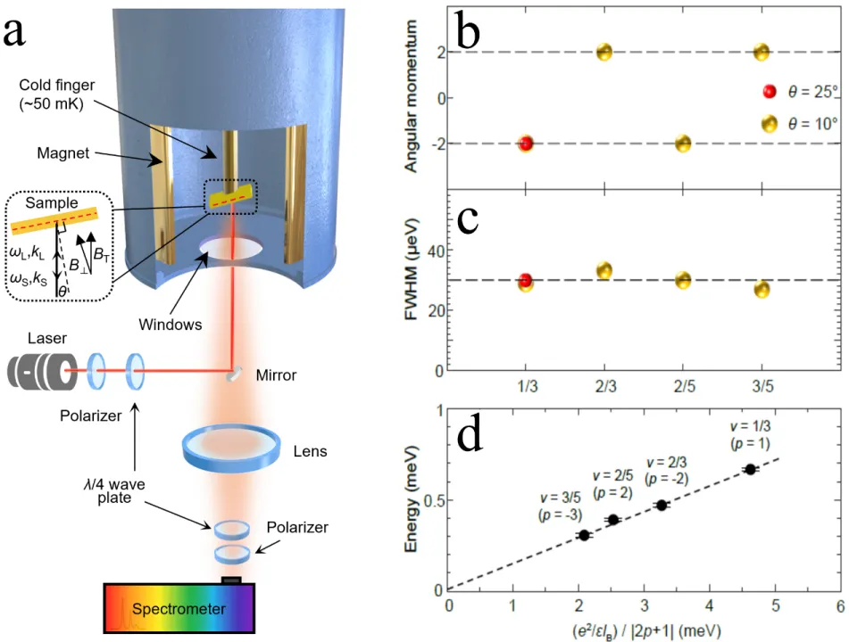 对于该实验测量,无论是从实验技术,还是从基础物理创新角度,都意味着是0到1的突破。杜灵杰带领团队,花费数年时间,通过精妙的设计将看似矛盾的测量要求一一实现,在南京大学自主设计、集成组装了一台根植于He3-He4稀释制冷技术的极低温强磁场共振非弹性偏振光散射系统(图3a)。这一特殊的“望远镜”有两层楼高,可以在零下273.1度下捕捉到最低达10GHz的微弱激发并判断其自旋。测试表明,这一技术的相关测量参数达到国际领先水平,为引力子激发的测量奠定了实验基础。依靠这一利器,实验团队在砷化镓半导体量子阱中成功观测到分数量子霍尔效应引力子,取得重要突破。团队通过共振非弹性光散射测量到了最低能量长波集体激发,并通过改变入射和散射光的自旋,观察到该激发具有自旋2的特性且是手性的(图3b)。并且测量到的极小激发峰宽符合动量守恒下引力子激发的长波特性(图3c),而测到的能量在m/n分数态正比于Ec/n(Ec为库伦能),符合其能量特性(图3d)。这些结果从自旋,动量和能量角度充分提供了引力子激发的实验证据。