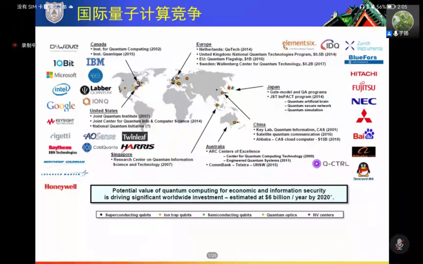 讲座的第一部分,于教授为我们介绍了2019年量子计算机领域的一大事件。谷歌研发的量子计算机可以200秒内完成世界顶级超算1万年的工作任务,宣布其量子霸权,该事件也使得国际量子计算竞争愈演愈烈,为我们国内的研发突破带来多重挑战。