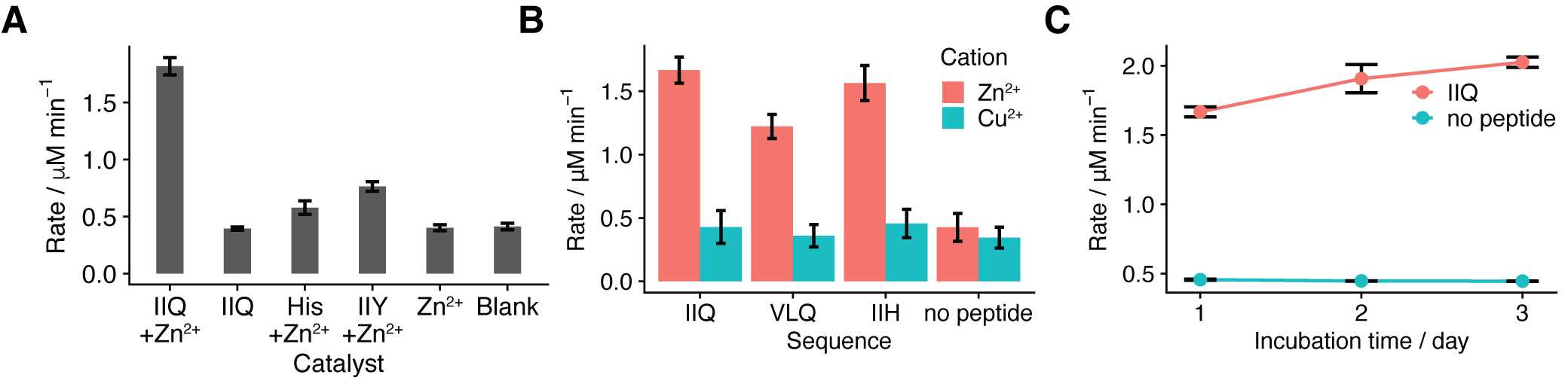 随后,研究者进行了一系列实验以验证在金属离子存在的条件下,自组装多肽在室温下是否确实具备催化硅烷产氢的能力。结果显示,与单独的多肽、组氨酸或金属离子相比,自组装多肽在存在金属离子的情况下显著展现出催化活性(图3A)。这表明多肽自组体与金属离子形成了特定的催化活性中心,验证了理论预测的结果。此外,实验结果还表明,催化性能受多肽序列和金属离子类型的影响(图3B)。另外,研究者还观察到多肽分子自组装的孵化时间对催化性能有显著影响(图3C),这进一步强调了组装结构与催化活性之间的直接关联。