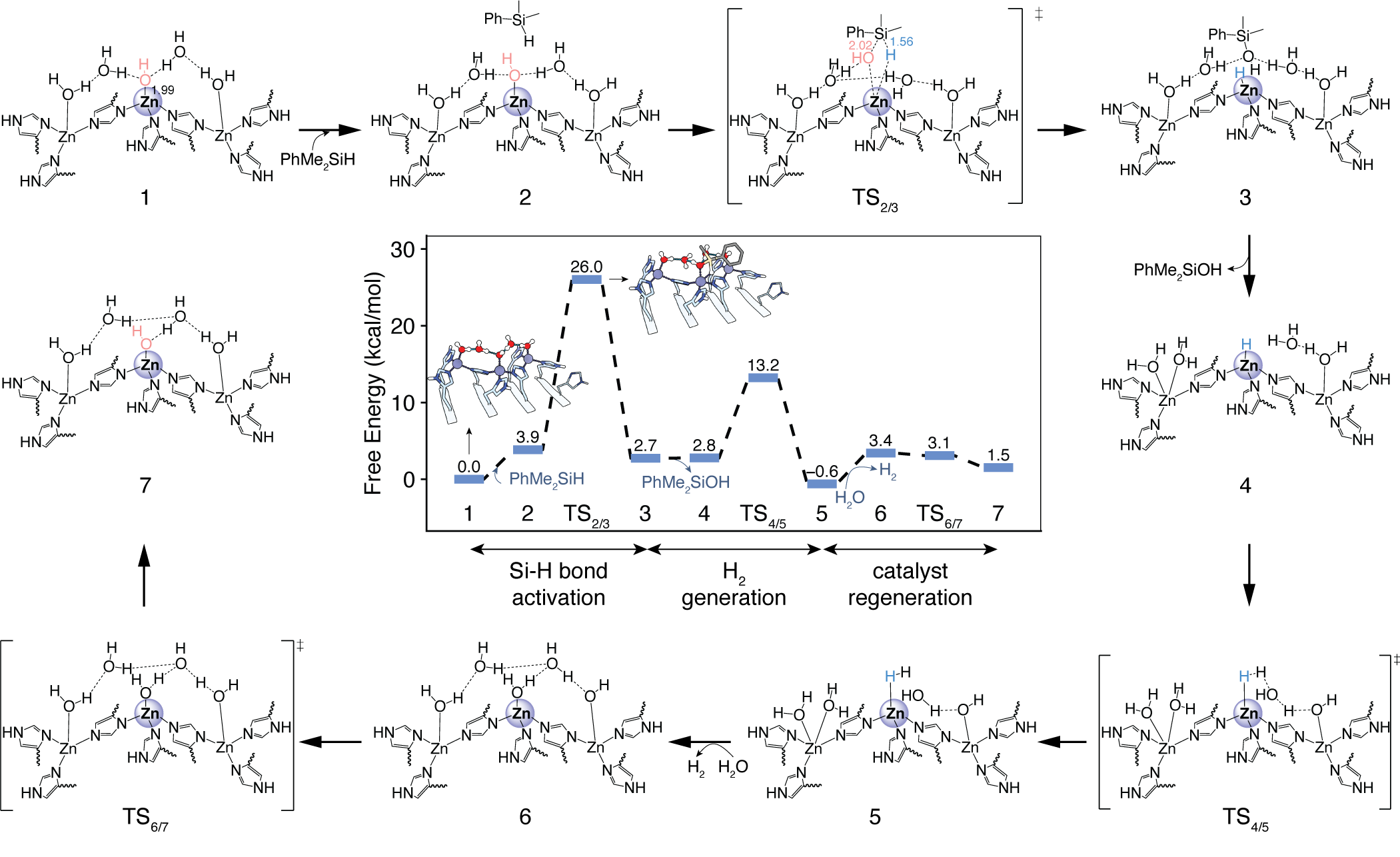 基于对催化中心的深入理解,研究人员构建了多种可能的催化反应中心结构(图1)。随后基于密度泛函方法,计算得到了自组装多肽侧链构成的反应中心催化硅烷水解产氢的完整反应路径。结果表明,多肽序列的差异会导致催化反应中心金属离子配位微环境存在差异,但不同自组装体发生催化反应的决速步均为金属中心活化的羟基对底物硅烷上硅中心的亲核进攻,且计算得到的自由能垒表明这些反应在室温下自发进行是可行的(图2)。