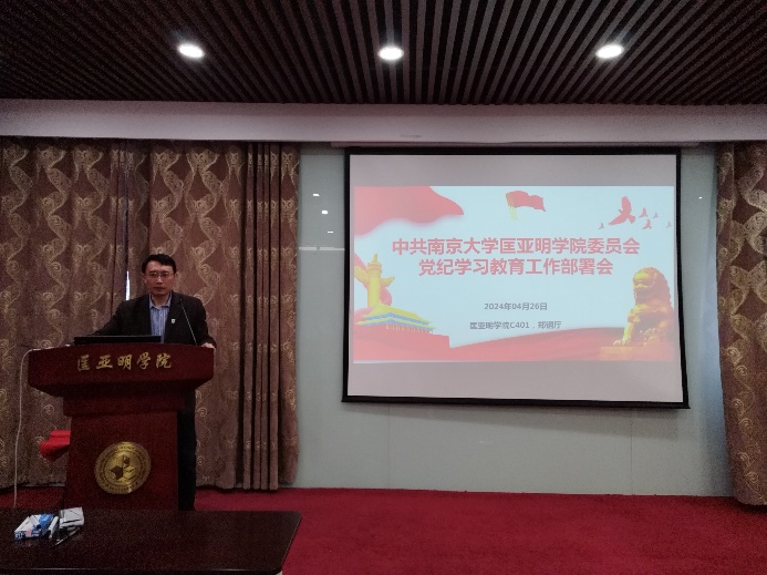 院长王骏结合贯彻落实南京大学“奋进行动”和学院工作,就学习贯彻《条例》做重点发言。王骏强调党纪学习教育让广大党员干部明方向知荣辱少进退,把方向更好地立在心里;在具体工作中,要结合时代特点、时代问题,以党纪为基本的要求和指引的方向,做好制度建设;《条例》是边界,身为党员领导干部要朝着党纪相反方为国家建设、学校发展、学院成长努力奋斗。