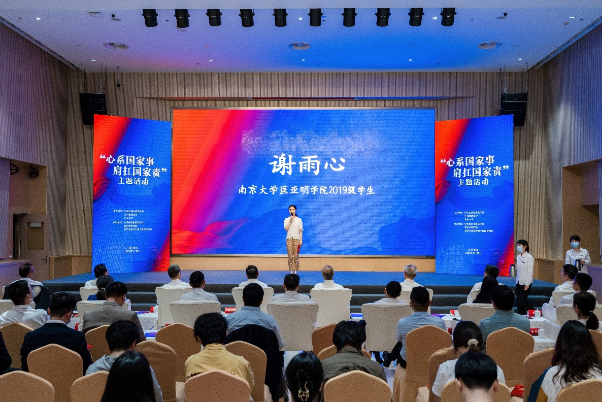 南京大学匡亚明学院项宇奇、谢雨心同学代表即将出国留学的学生群体向大家表达了自己学成报国的决心。项宇奇现在美国交流学习,他以视频的形式分享了自己的留学经历和作为新时代青年的担当意识;谢雨心即将前往康奈尔大学攻读化学博士项目,她与大家分享了自己对于留学的深刻思考:“才能与责任是密切联系的,我们有幸生活在这个伟大的时代,有幸接受良好的教育,这些都得益于祖国的繁荣昌盛,那么我们自然要有责任与担当,将来也要成为新一代的挖井人,服务人民、回馈社会。”