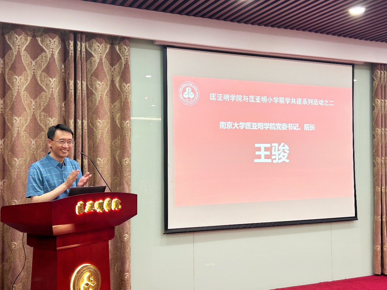 王骏在欢迎辞中对匡亚明小学师生的到来表示热烈欢迎,并感谢学校关工委对活动的积极支持和指导。他表示,在“六一”儿童节即将到来之际,从青春活泼的小学生到精神矍铄的老教授,几代人欢聚一堂共话成长非常有意义,不仅是大手牵小手的共同成长,更是对匡老的革命风骨、教育理念、学术思想的脉脉相传。希望此次活动能够帮助小学生开拓视野,激发学习动力,树立远大理想,不断奋进新征程;也希望匡院与匡小在匡老为国育才思想的指引下,常交流多合作,携手奋进新征程,为教育事业贡献力量。
