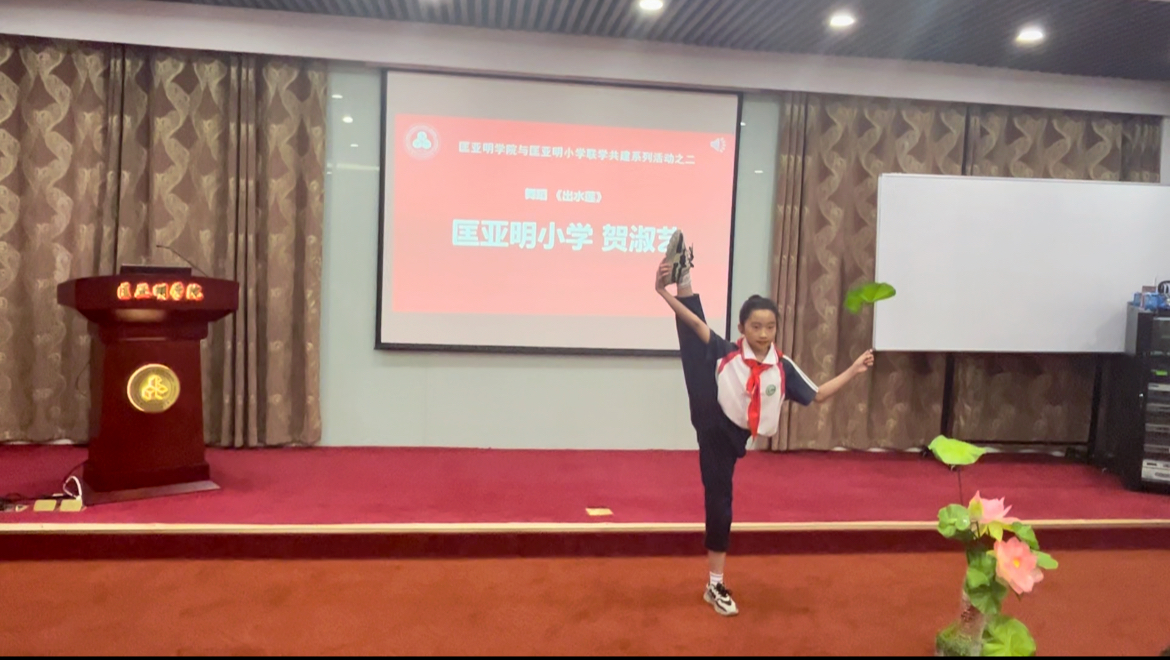 活动中,与会同学们给大家带来精彩的文艺表演。匡亚明小学贺淑艺同学表演了舞蹈《出水莲》,婀娜多姿,如出水芙蓉,赢得阵阵掌声。匡亚明学院2021级林佳雄同学展示了跳花绳,技术娴熟,身手矫健,展现力量与美的结合,获得连连喝彩。