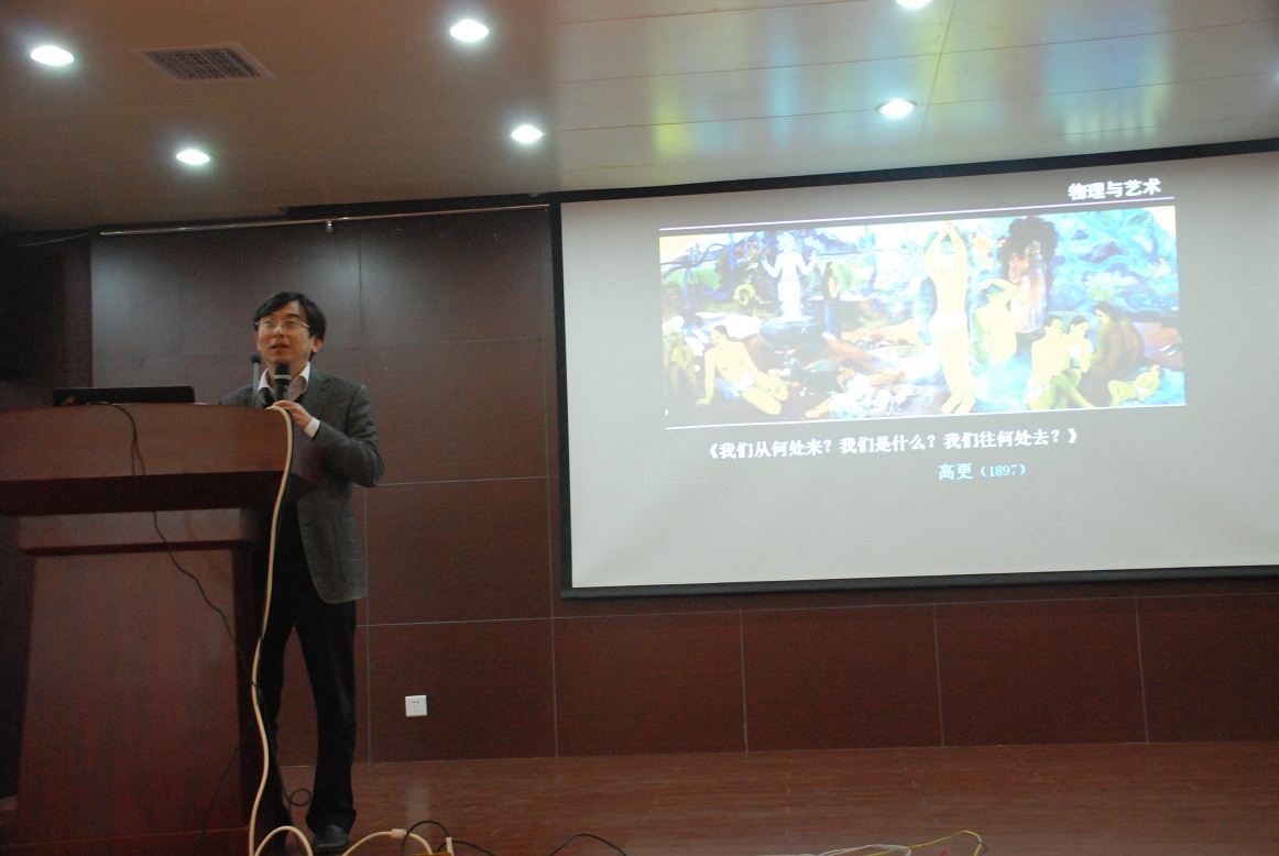 施大宁教授的研究方向是凝聚态理论物理,他不仅在学术科研方面卓有成就,而且对科学的理解也独树一帜。施大宁教授首先向同学们展示了几张生动有趣的图片,在这些图片中,爱因斯坦、毕加索、公牛、夸克……这些看似毫无联系的人或物竟能很完美的结合在一起,这说明艺术和科学是密不可分的。但事实远不止这么简单——这二者具有本质上的联系。艺术界的乔托到达芬奇到毕加索,科学界的哥白尼到牛顿到爱因斯坦,艺术和科学都经历了从不成熟到成熟,其理念也完成了从绝对时空到相对时空的转变。施教授一一列举了历史上最具代表性的艺术家、科学家们的事例,就艺术和科学的相互渗透与融合方面进行了深入的阐释。为了更形象的说明这个问题,施教授还举例,如果爱因斯坦和马奈、毕加索一同以光速前行,那么在相对论效应下,正前方的景象就好像马奈《草地上的午餐》一画中描述的那样,遥远的景色近在眼前,一切是那么的合理;侧面窗外的世界全部在二维状态下展示在我们面前,毕加索的立体主义在这里体现的淋漓尽致。不仅如此,施教授还举了很多诗词名句,许多古典诗词中也都蕴含着对于科学的深深的思考——原来,优秀的艺术中竟能蕴含这样美妙的科学!