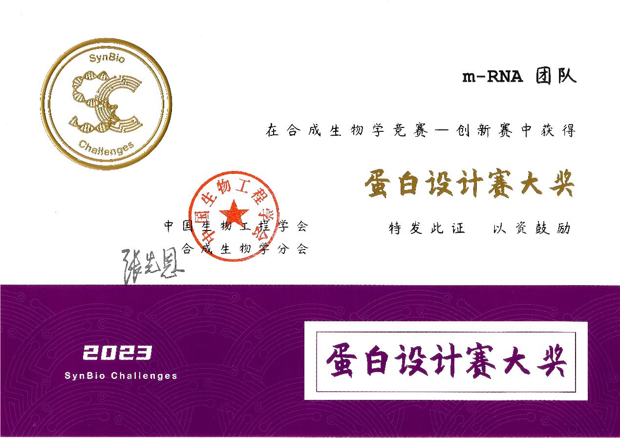 8月5日,由中国生物工程学会合成生物学分会主办的第二届合成生物学竞赛·创新赛在深圳理工大学(筹)明珠校区举办了现场答辩及颁奖典礼。本次活动吸引了来自全国(含港澳)48所高校共80支队伍合计超400人线下参赛,线上线下超421万人次观赛。经过历时近半年的激烈角逐,我校董昊教授课题组的张一健(化院19本、匡院23硕)、陈子川(匡院19本)和臧敏(匡院21硕)等三位具有化学和计算机学科背景的同学组成的南京大学“m-RNA”团队最终以总分第一的成绩荣获蛋白设计赛大奖(金奖)。