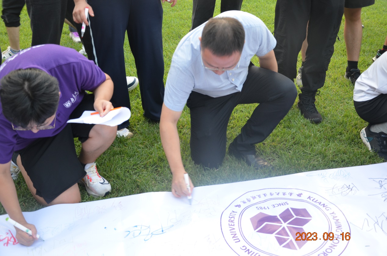 所有老师和同学在印有匡亚明学院院徽的长幅上签下自己的名字,这张由所有23级匡院成员名字组成的全家福也就此张贴在院楼中,标志着新一届匡院学子的扬帆远航