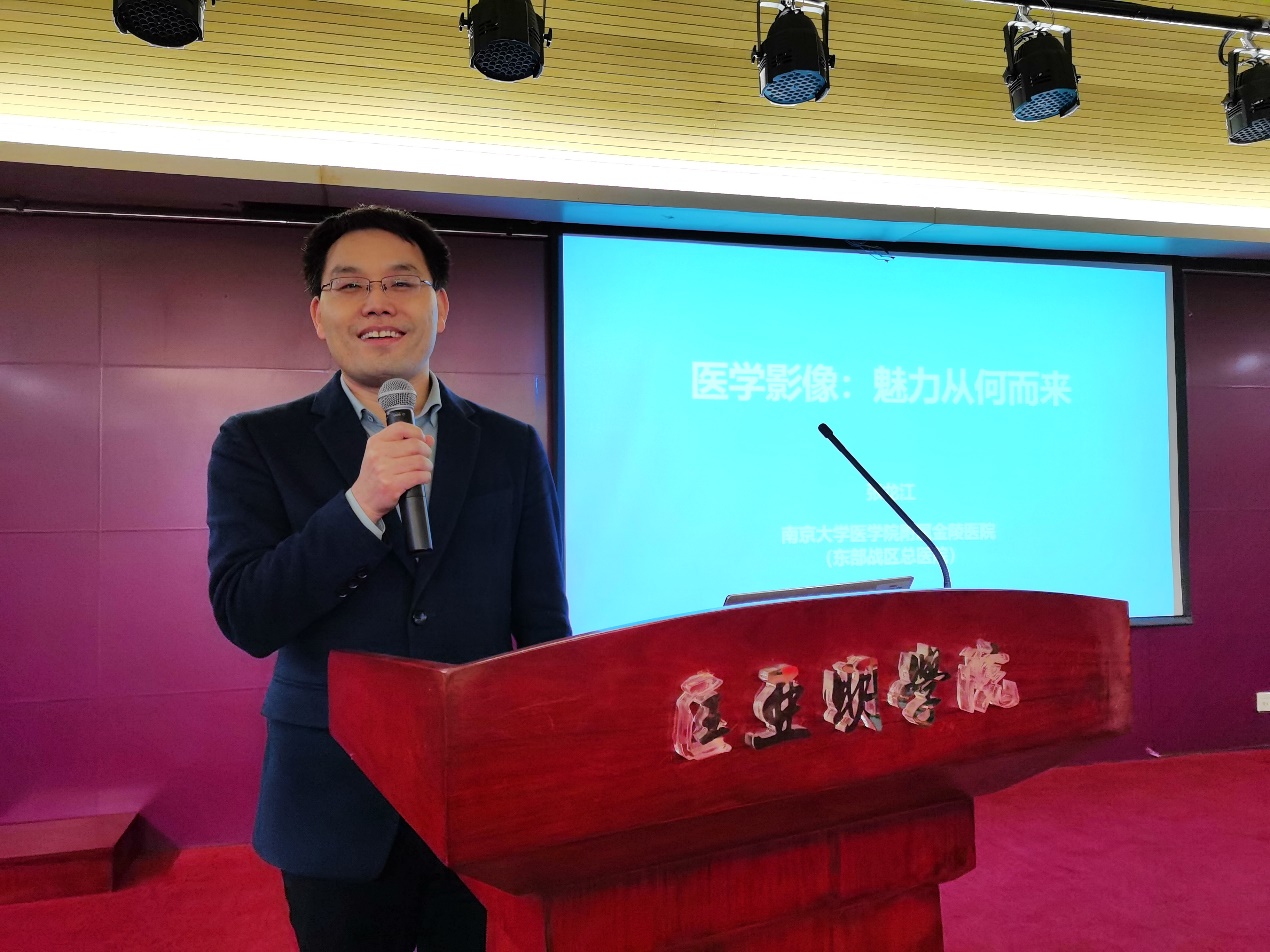 张主任先介绍了自己所在东部战区总医院的历史沿革与发展近况,并向同学们普及了有关放射与影像科的基础知识和发展历史。主任结合同学们的生活实际与当下热点,用幽默风趣的语言阐述了大众眼中以及医生眼中的放射科,科普了医学影像学领域的相关内容,诸如计算机断层成像(CT)、磁共振成像(MRI),等等。