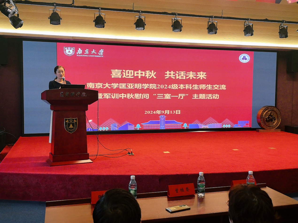 2024年9月13日,“喜迎中秋 共话未来”南京大学匡亚明学院2024级本科生师生交流暨军训中秋慰问“三室一厅”主题活动在潘琦楼国生报告厅圆满举行。匡亚明学院党委书记周媛、党委副书记周安、副院长董昊、班主任郭亚冲、老师代表以及2024级全体本科生130余人共同参加活动。活动由周安主持。