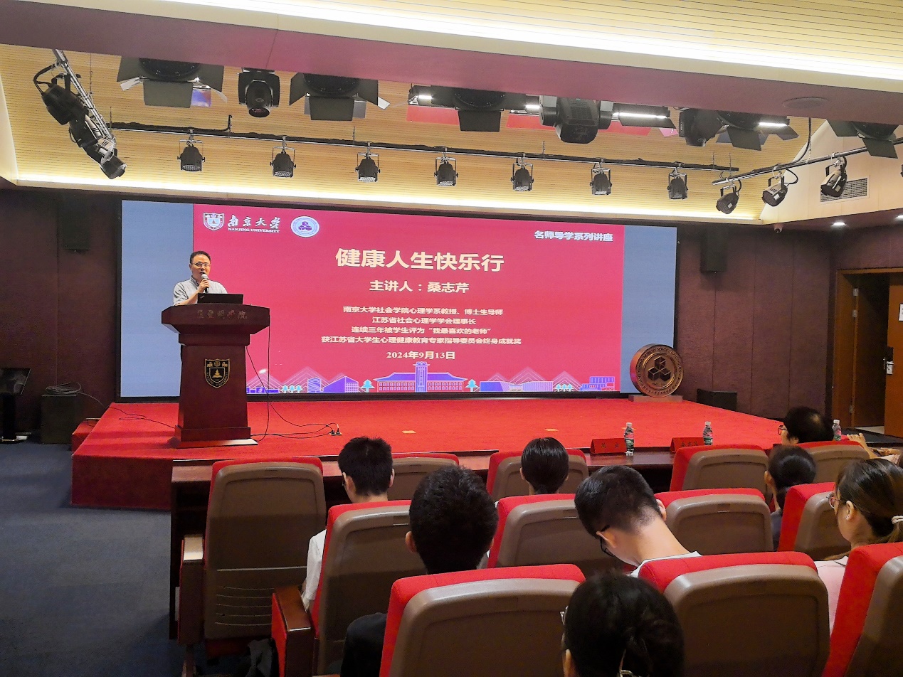 2024年9月13日晚上,匡亚明学院新生入学教育暨“寻根科研路,传承报国情”第一期主题党团课在仙林校区潘琦楼成功举办。本次活动邀请了南京大学社会学院心理学系教授、博士生导师、江苏省社会心理学学会理事长桑志芹教授做题为“健康人生快乐行”主题讲座,学生党支部书记司林敏,辅导员赵玉倩、陈丹以及学生党支部、2023级本科生、2024级研究生。讲座由匡亚明学院党委副书记周安主持。