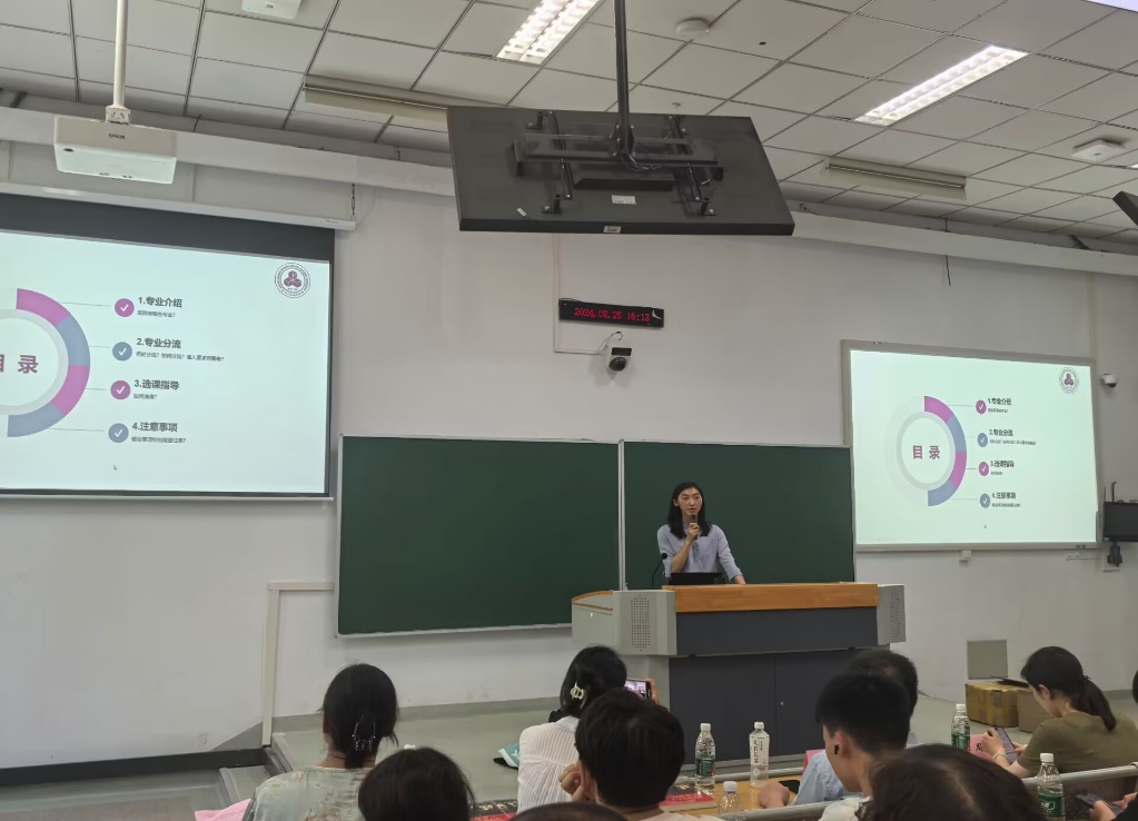 王芳介绍了课程和选课情况,从专业介绍到专业分流,再到选课指导及注意事项,为新生和家长答疑解惑,并分享学业辅导结队计划。