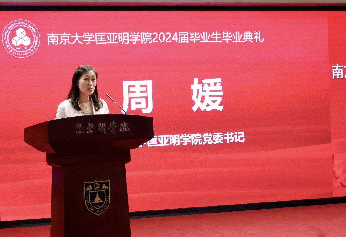 首先,匡亚明学院党委书记周媛老师向全体毕业生表示祝贺。她回顾了同学们在学院的收获与成长,特别是在思想引领、科技创新和社会服务等方面,为南大、为学院赢得了荣光,也体现了社会责任,同学们是学院的骄傲与自豪。另外,她也感谢了老师和家长的辛勤付出,祝福同学们以匡院为起点,坚定信念、前程似锦。